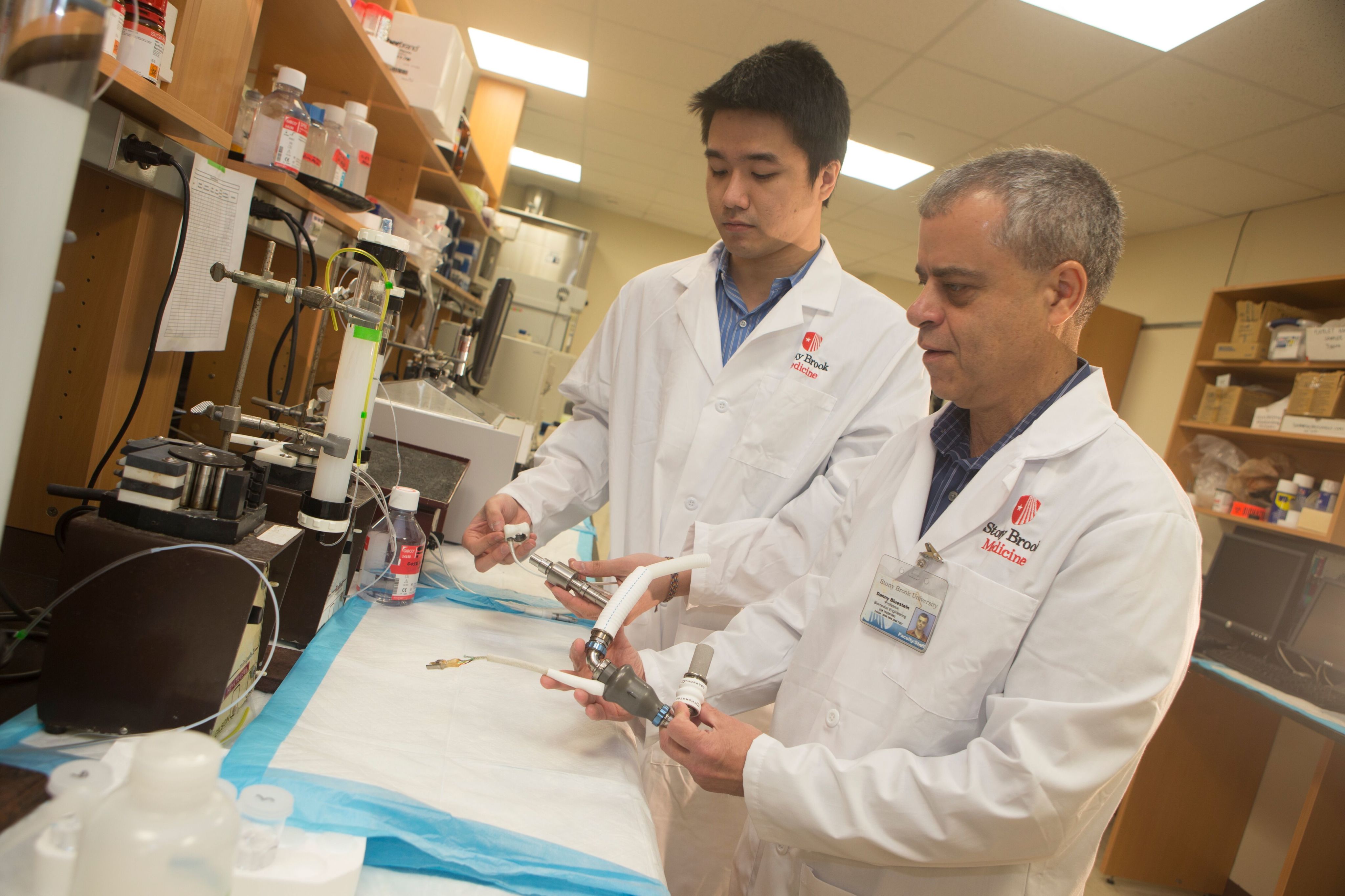Danny Bluestein, SUNY Distinguished Professor in the Department of Biomedical Engineering (right), is also the principal investigator at PolyNova Cardiovascular Inc., which is developing prosthetic heart valves. Through the company's partnership with SPIR, students can work on projects “directly related to their PhD dissertation.”
